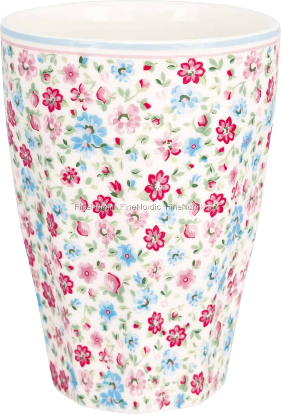 Lass dich vom French Latte Cup Louisa White in einen friedlichen skandinavischen Garten in voller Blüte entführen. Jeder Schluck wird zu einem Moment stiller Besinnung, während du das filigrane Gewebe winziger Blüten bewunderst, die über die glatte Keramik verstreut sind. GreenGate hat die Essenz eines unbeschwerten Sommertages perfekt eingefangen, mit zarten Schattierungen von Rosa, Blau und Rot, die Erinnerungen an frisch gepflückte Blumen wecken. Die schlichten blauen und rosa Streifen am Rand verleihen dem Ganzen einen letzten, durchdachten Hauch von klassischem dänischem Design.