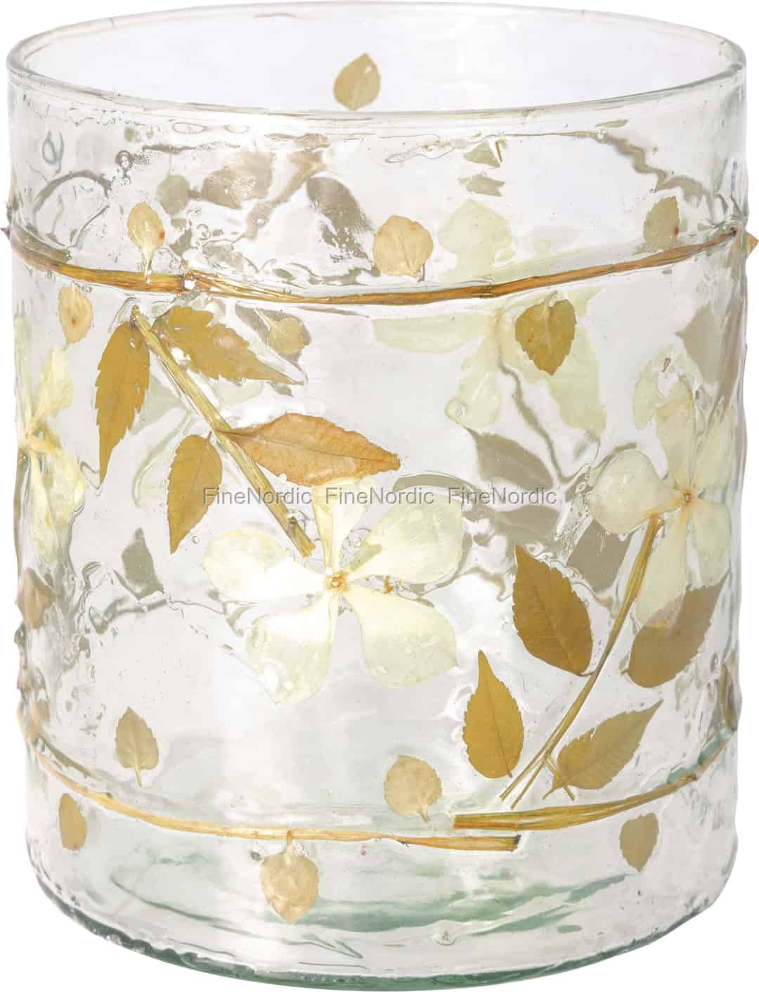 Entdecke ein Stück, das wirkt, als wäre es direkt von einem sonnengetupften Waldboden gesammelt worden. Diese GreenGate Hurricane ist ein kleines Designwunder, in dem zarte, cremefarbene Blüten und herbstliche Blätter sorgfältig zwischen Schichten aus klarem, strukturiertem Glas konserviert sind. Jede winzige Luftblase und sanfte Welle im Glas erzählt die Geschichte seiner Entstehung und macht es zu einem organischen und fesselnden Objekt. Die beiden feinen Bänder, die die Form umschließen, verleihen einen rustikalen, letzten Schliff und erden das Design in natürlicher Schlichtheit.
