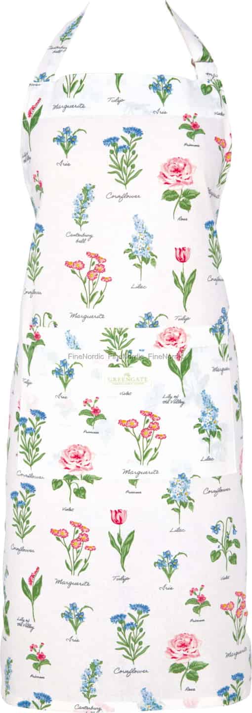 Stellen Sie sich einen sanften Spaziergang durch einen blühenden Garten vor, den Skizzenblock in der Hand, um die zarten Formen jeder einzelnen Blüte einzufangen. Die Schürze Agnes White von GreenGate fängt dieses Gefühl wunderschön ein. Jede Blume, von der bescheidenen Kornblume bis zur romantischen Rose, ist mit künstlerischer Detailverliebtheit wiedergegeben und mit einer eleganten Schrift versehen, was auf reiner, weicher Baumwolle ein wahres botanisches Wunderland erschafft. Es ist ein Design, das die einfache, stille Schönheit der Natur zelebriert.
