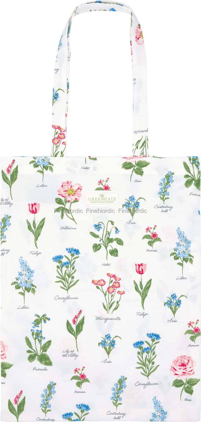 Mit der Tasche Agnes White lädt GreenGate Sie ein, ein Stück skandinavischen Garten bei sich zu tragen. Die strahlend weiße Baumwolle dient als Leinwand für eine reizvolle Vielfalt botanischer Illustrationen – vom zarten Flieder bis zur fröhlichen Kornblume, jede mit kunstvoller Detailverliebtheit dargestellt. Dies ist nicht nur eine Tasche; es ist eine Hommage an die schlichte Schönheit der Natur, entworfen, um ein wenig Freude und Farbe in Ihren Tag zu bringen, ganz gleich, ob Sie die örtliche Bibliothek besuchen oder frisches Brot vom Bäcker holen.