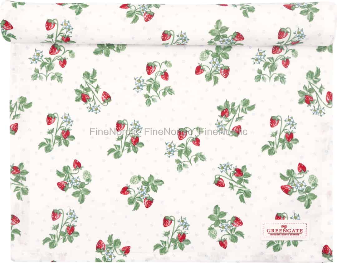 Stellen Sie sich einen sonnenverwöhnten Morgen in einem skandinavischen Garten vor, mit dem süßen Duft von Walderdbeeren in der Luft. Dieser entzückende Tischläufer 'Berry White' von GreenGate fängt genau diesen Moment ein und bringt einen Hauch von nostalgischem Charme und sommerlicher Wärme in Ihr Zuhause.