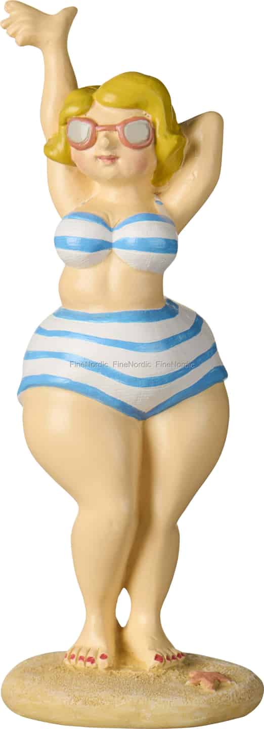Lassen Sie sich von dieser wunderbar selbstbewussten 'Beach Queen' von Ib Laursen an eine sonnenverwöhnte dänische Küste entführen. Mit ihren in glückseliger Entspannung nach hinten gestreckten Armen verkörpert sie den einfachen, unbeschwerten Geist eines lang ersehnten Sommerurlaubs. Ihre fröhlich blau-weiß gestreifte Badekleidung und die Retro-Sonnenbrille wecken eine zeitlose Nostalgie und erinnern an faule Nachmittage am Meer, nur begleitet vom Rauschen der Wellen. Sie ist eine kleine, fröhliche Hommage daran, jeden Sonnenstrahl in vollen Zügen zu genießen.