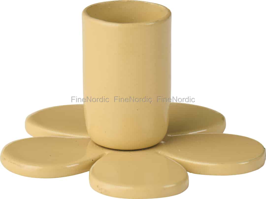 Entdecken Sie die schlichte Freude an diesem charmanten Kerzenhalter von Ib Laursen. Sein Design ist eine stille Hommage an die Natur, bei der sechs abgerundete Blütenblätter eine stabile Basis für eine einzelne, schmale Kerze bilden. Das gesamte Stück ist aus robustem Metall gefertigt und in einem wunderschönen Cafe Cream veredelt – einem warmen und behaglichen Farbton, der an einen Milchkaffee an einem gemütlichen Sonntagmorgen erinnert. Das Finish besitzt eine subtile, rustikale Qualität, die von der Sorgfalt und dem Charakter zeugt, die das skandinavische Design ausmachen. Es ist ein kleines Objekt, das jedoch das Versprechen eines warmen und sanften Scheins in sich trägt.