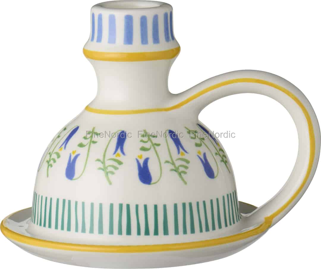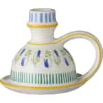 Lass den sanften Charme dieses Kerzenhalters von Ib Laursen deinen Raum mit Licht und Persönlichkeit erfüllen. Die cremefarbene Keramik ist die perfekte Leinwand für eine entzückende Szene: Fröhliche gelbe Linien umrahmen Bänder aus grünen und blauen Streifen, während eine Girlande aus blauen Wildblumen an einen Spaziergang durch eine sonnenverwöhnte Wiese erinnert. Die glänzende Oberfläche fängt das Licht ein, lässt die Farben leuchten und verleiht dem Halter einen dezenten Schimmer. Dies ist nicht nur ein Kerzenhalter – es ist ein kleines, funktionales Kunstwerk, das eine Geschichte von schlichter, ländlicher Schönheit erzählt.