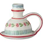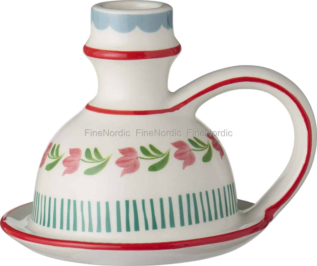 Inspiriert von den fröhlichen Mustern skandinavischer Volkskunst, ist dieser Kerzenhalter von Ib Laursen eine kleine Feier der Farbe und Tradition. Jedes Detail, von den zartrosa Blüten und grünen Streifen bis hin zu den leuchtend roten, glänzenden Linien, ist darauf ausgelegt, Ihnen ein Lächeln ins Gesicht zu zaubern. Die cremeweiße Keramikbasis bietet eine warme Leinwand, während die klassische Form des Kammerleuchters – mit seinem praktischen Henkel und Untersetzer – an einfachere Zeiten erinnert, als eine einzige Flamme genügte, um einem Raum das Gefühl von Zuhause zu geben.