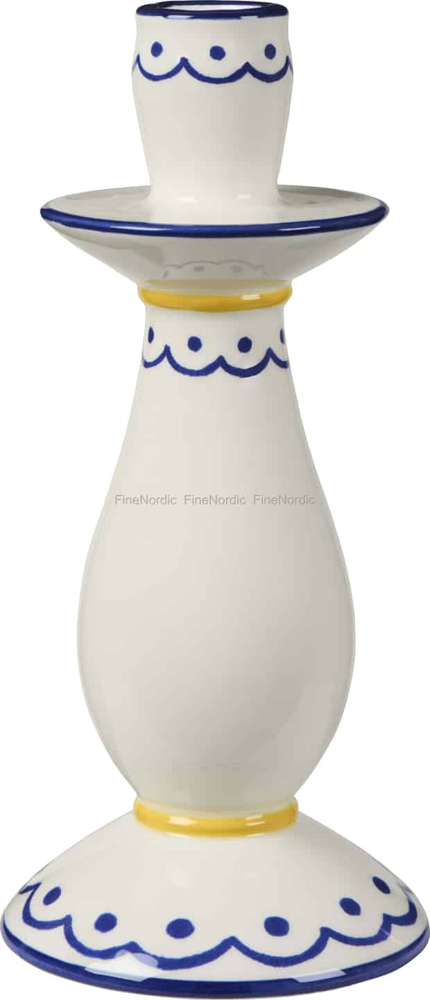 Inspiriert von der fröhlichen Schlichtheit eines dänischen Sommerhauses, ist dieser wunderschöne Kerzenhalter von Ib Laursen eine kleine Feier der Farbe und des Handwerks. Die glänzende, cremeweiße Keramik bietet die perfekte Leinwand für die tiefblauen, handgemalten Wellenmuster, die um seinen Fuß und Rand tanzen. Leuchtende, sonnengelbe Bänder sorgen für einen fröhlichen Kontrast, fangen das Licht ein und wecken Erinnerungen an lange, sonnendurchflutete Nachmittage. Man spürt die Sorgfalt in seiner glatten, robusten Form – ein Zeugnis durchdachten Designs, das dazu bestimmt ist, geschätzt zu werden.