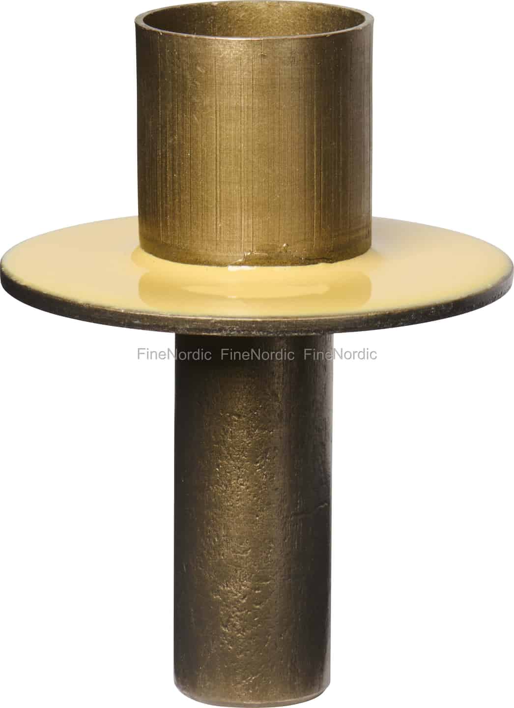 Aus dem Herzen des dänischen Designs präsentiert Ib Laursen eine einfache und geniale Möglichkeit, Atmosphäre zu schaffen. Dieser Kerzenhalter ist eine Hommage an gefundene Objekte und die sanfte Magie des Kerzenlichts. Sein cleveres Design ermöglicht es Ihnen, jeder leeren Flasche mit einer Geschichte einen neuen Zweck zu geben und sie in ein wunderschönes Element für Ihr Zuhause zu verwandeln. Der Kontrast zwischen dem rustikalen, texturierten Metall und dem glatten, butterweichen Gelb des Emaille-Tropfenfängers ist eine wahre Freude und verleiht jedem Ort, an dem Sie ihn platzieren, Farbe und Charakter.