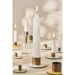 Dieser Halter ist perfekt für eine handelsübliche 3,8 cm Kerze und bietet eine stabile und stilvolle Basis. Sein Charme entfaltet sich besonders, wenn mehrere Exemplare zusammen dekoriert werden. Stellen Sie sich ein Trio auf Ihrem Esstisch für ein intimes Essen vor oder eine Sammlung, die entlang eines Holzbalkens für eine rustikale, stimmungsvolle Dekoration verteilt ist. Der gelbe Farbtupfer bringt eine sanfte Energie mit sich, die natürliche Materialien wie Holz und Leinen ergänzt und es Ihnen ermöglicht, eine persönliche und einladende Atmosphäre in Ihrem Zuhause zu schaffen.