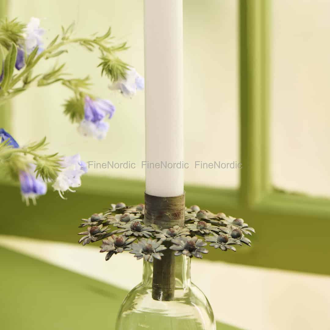 Entdecken Sie die stille Freude, aus Altem etwas Neues zu schaffen – mit diesem wundervoll charaktervollen Kerzenhalter von Ib Laursen. Aus Metall gefertigt und mit einer sorgfältig patinierten Oberfläche versehen, erzählt er eine Geschichte von rustikaler Schlichtheit. Jeder Halter ist mit einem zarten botanischen Kranz geschmückt, einer winzigen Girlande aus Blumen und Beeren, die von einer nordischen Wiese gesammelt zu sein scheint. Dies ist nicht nur ein Kerzenhalter; es ist ein kleines Kunstwerk, das Ihre Kreativität anregen und einen Hauch von verwittertem, romantischem Charme in Ihr Zuhause bringen soll.