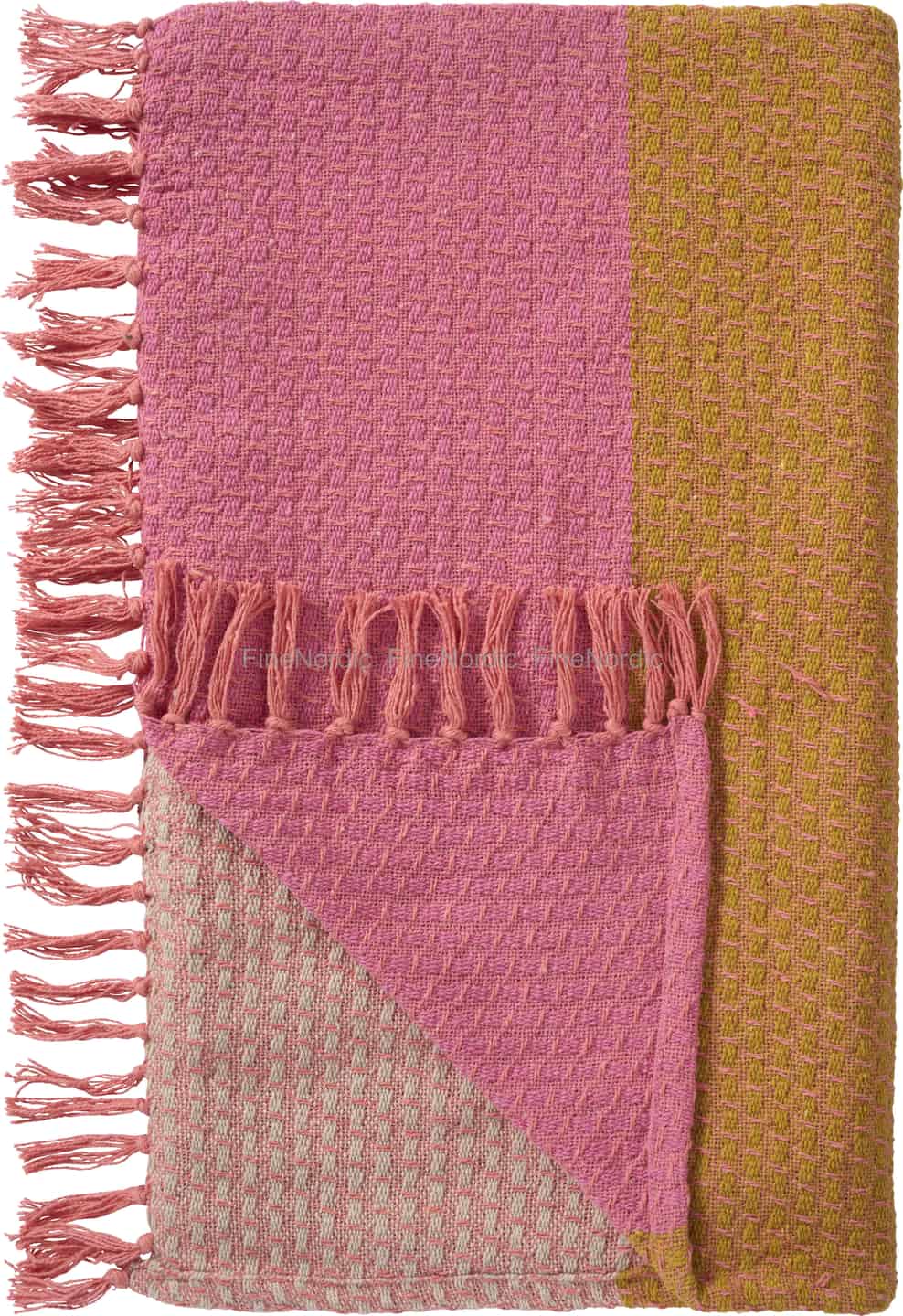 Stellen Sie sich den sanften Schein einer untergehenden Sonne vor, eingefangen in gewebter Baumwolle. Dieses wunderschöne Plaid von Ib Laursen bringt eine sanfte Wärme in jeden Raum, mit seiner einladenden Textur und einer Palette aus Altrosa, warmem Senfgelb und Naturtönen.