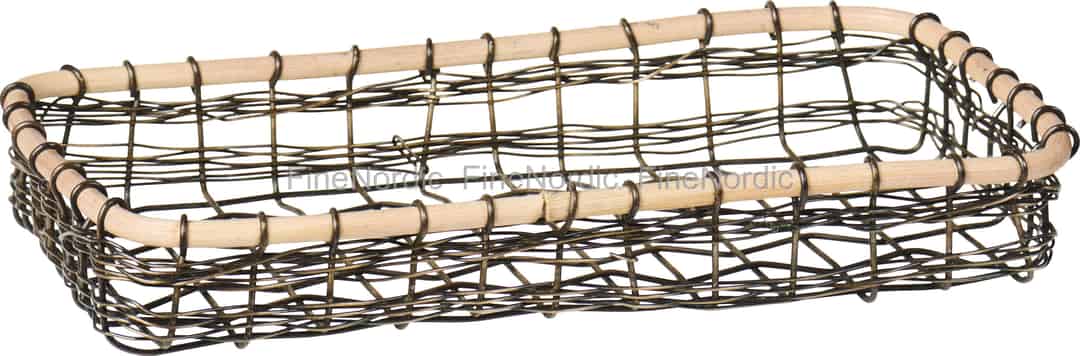 - Eine Mischung aus rustikalen Materialien: Gefertigt aus einem robusten Metalldrahtgeflecht mit antikem Messing-Finish, das im Kontrast zu einem glatten, natürlichen Bambusrand steht, bietet dieses Stück sowohl Langlebigkeit als auch eine warme, organische Ästhetik.