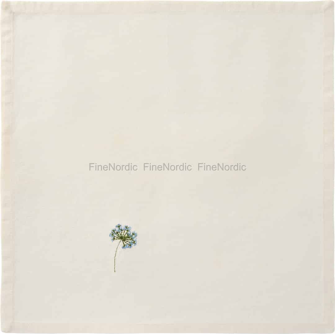Stellen Sie sich Ihren Tisch vor, gedeckt mit dem schlichten Charme einer ländlichen Wiese. Diese wunderschöne Serviette in Buttermilchcreme, gefertigt aus weicher Baumwolle, ziert eine einzelne, zart gestickte blaue Doldenblüte, die Ihren Mahlzeiten einen Hauch von Naturpoesie verleiht.
