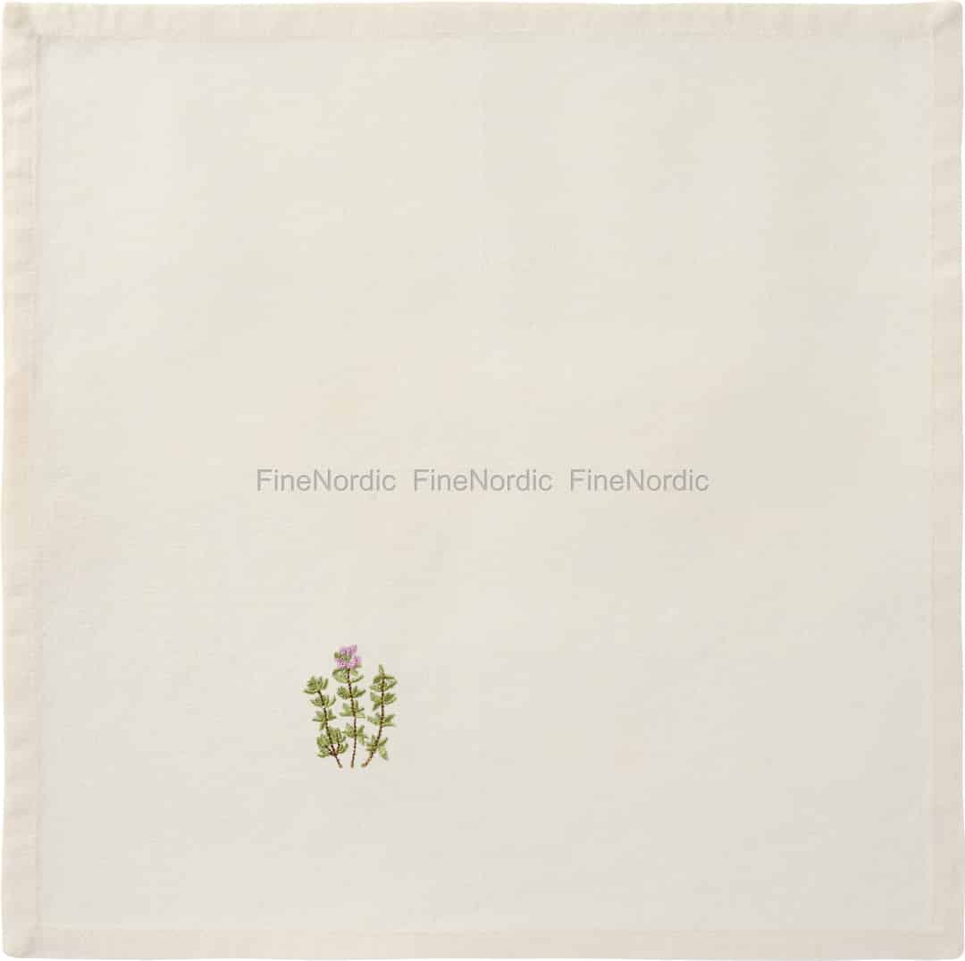Laden Sie den sanften Charme eines skandinavischen Sommers an Ihren Esstisch ein. Diese wunderschön schlichte, buttercremefarbene Serviette von Ib Laursen ziert ein einzelner, zarter Zweig gestickten Thymians – eine subtile Hommage an die stille Schönheit der Natur.