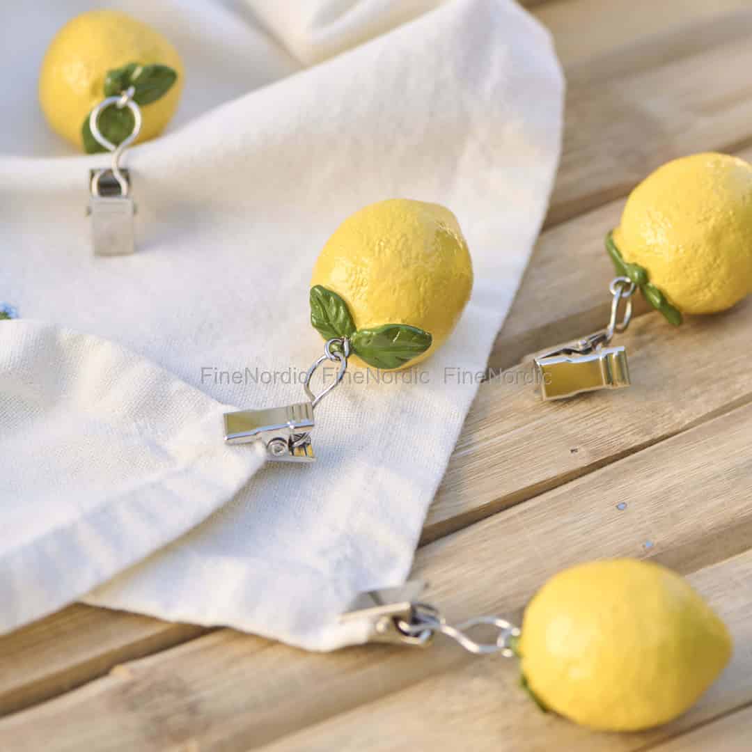 Jede Zitrone ist aus fröhlichem, glänzendem Polyresin gefertigt und fängt das rustikale Gefühl eines sonnenverwöhnten Obstgartens ein. Das leuchtende Gelb und das frische grüne Blatt bringen Leben und Farbe auf jedes Leinen, von strahlendem Weiß bis hin zu gemusterten Stoffen. Die zuverlässigen Metallklammern sind einfach zu befestigen und halten fest, sodass Sie sich entspannt zurücklehnen können. Dieses entzückende 4er-Set ist ein Beweis für das Talent von Ib Laursen, Accessoires zu kreieren, die sowohl wunderbar funktional als auch voller Herz sind.