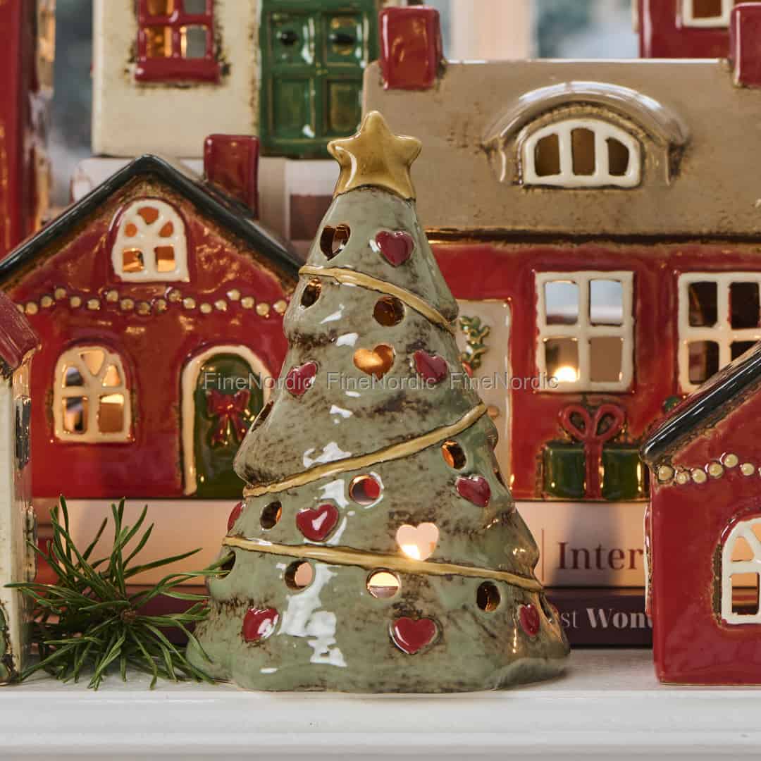 Inspiriert von der friedlichen Stille eines nordischen Weihnachtsabends lädt der Teelichthalter „Stillenat“ von Ib Laursen Sie dazu ein, innezuhalten und die leise Magie der Jahreszeit zu umarmen. Sein verspieltes Design mit glänzend salbeigrüner Glasur, fröhlichen roten Herzen und einem goldenen Stern fängt ein Gefühl nostalgischer Freude ein. Wenn Sie ein Teelicht hineinstellen, erwacht der Baum zum Leben und wirft einen sanften, gemusterten Schein, der jede Ecke Ihres Zuhauses in einen gemütlichen Zufluchtsort verwandelt.