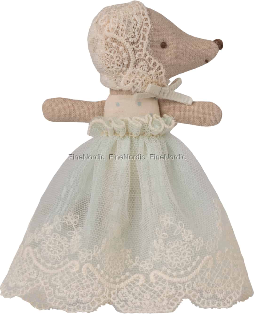 Stellen Sie sich eine winzige Maus vor, die mit der Morgensonne erwacht, ihre kleinen Augen leuchten und sind bereit für einen Tag voller Abenteuer. Gekleidet in ein wunderschönes mintfarbenes Kleid mit einem gepunkteten Mieder und einem gerüschten Kragen, ist sie immer bereit für eine Teeparty oder eine leise Geschichte in einer gemütlichen Ecke. Ihre kunstvolle Spitzenhaube, mit einem weichen Band gebunden, verleiht einen Hauch von Vintage-Charme, der zeitlos wirkt, als wäre sie direkt aus einem klassischen Märchen entsprungen.