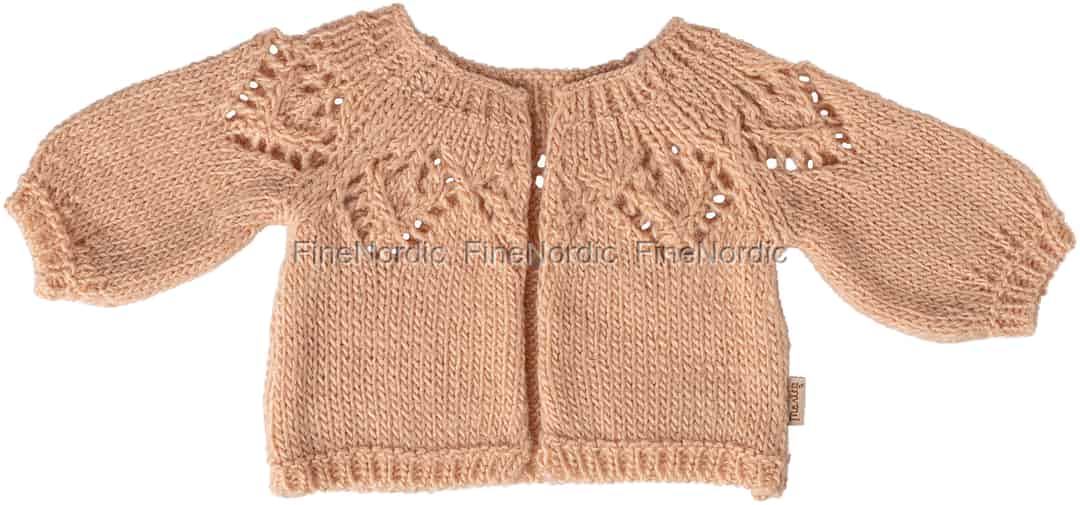 Jedes Detail dieser Maileg-Strickjacke ist darauf ausgelegt, Geschichten zu inspirieren. Der weiche, hellrosa Strick fühlt sich wunderbar sanft an, und das filigrane Lochmuster über den Schultern zeugt von der durchdachten Handwerkskunst, für die Maileg bekannt ist. Die bezaubernden Puffärmel und der klassische Rippensaum schaffen eine zeitlose Silhouette und verwandeln ein schlichtes Outfit in etwas ganz Besonderes. Es ist ein Kleidungsstück, das dazu einlädt, innezuhalten und die kleinen, wunderschönen Details zu würdigen, die Fantasiewelten zum Leben erwecken.