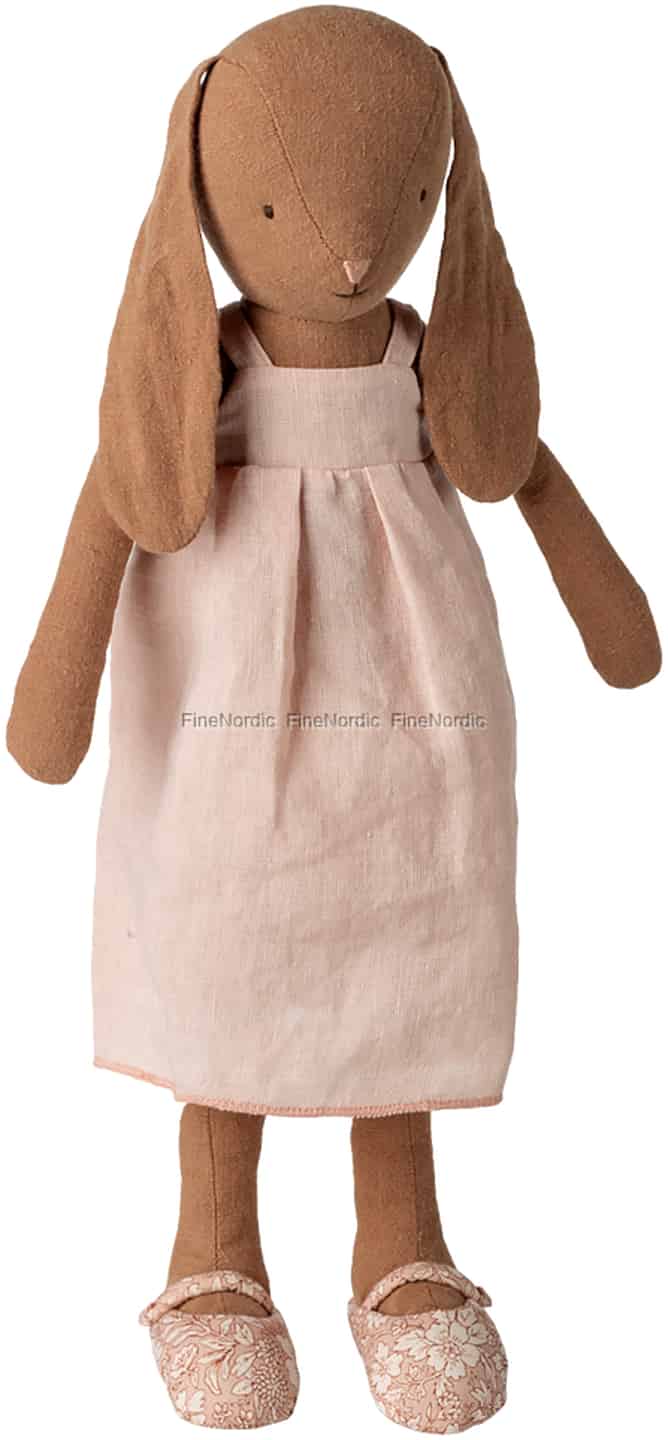 Stell dir die leise Freude vor, wenn dein kleiner Schatz seine neue beste Freundin kennenlernt. Dieser wunderschöne Maileg Hase mit seinem warmen, schokoladenbraunen Fell und den freundlichen, gestickten Augen ist dazu geschaffen, geliebt zu werden. Ihre langen Schlappohren sind perfekt, um Geheimnissen zu lauschen, und ihr weicher, knuddeliger Körper ist bereit für unzählige Umarmungen. Sie ist für einen Tag voller sanfter Spiele gekleidet, in einem schlichten rosa Kleid und den süßesten geblümten Schuhen – ihr Outfit spiegelt den zeitlosen Charme des skandinavischen Designs wider. Jedes Detail ist sorgfältig durchdacht, um Freude und Geborgenheit zu schenken.