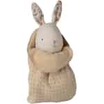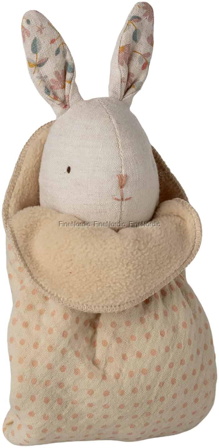 Stellen Sie sich die weichsten Umarmungen und die leisesten Momente vor. Dieses liebe kleine Häschen, eingebettet in seinem gemütlichen Beutel, ist bereit, der allererste Freund Ihres kleinen Lieblings und der Hüter seiner süßesten Träume zu werden.