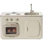- Eine komplette Küchenzeile: Sie vereint Herd, Backofen und Spüle in einer kompakten, 19 cm breiten Einheit und bietet alles, was man braucht, um das belebte Herz eines Miniaturhauses zu schaffen.