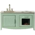 Stellen Sie sich das sanfte Treiben in Ihrem Maileg-Mäusehaus vor, das sich ganz um diese entzückende Küche dreht. Mit ihrer zarten mintfarbenen Lackierung und den liebevollen Vintage-Details ist sie die perfekte Kulisse für Ihre kleinen Freunde, um winzige Leckereien zu backen und unzählige Geschichten auszutauschen.