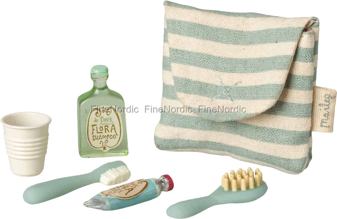 Maileg Miniatur-Zahnbürsten-Set in Tasche für Maus - Blau gestreift