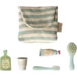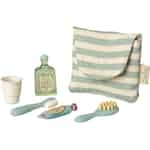 Stell dir vor, wie dein kleiner Maus-Freund mit der Sonne erwacht, bereit für den neuen Tag. Er kann sich mit der winzigen Zahnbürste die Zähne putzen, einen Schluck Wasser aus dem kleinen Becher nehmen und seine gestreifte Waschtasche für ein großes Abenteuer packen. Jedes Teil in diesem Set ist mit der Liebe und Sorgfalt gefertigt, die Maileg so besonders macht – von den Etiketten im Vintage-Stil bis hin zur weichen Haptik der Stofftasche.