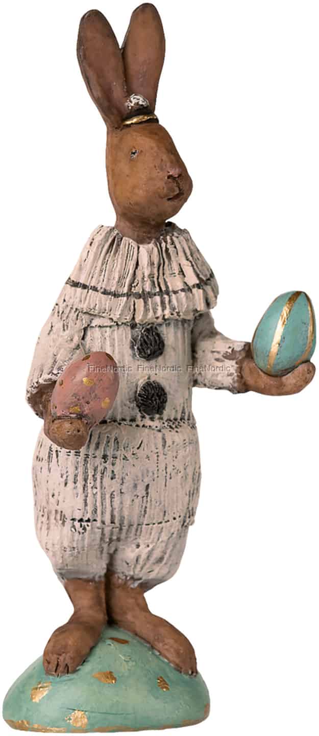 Lernen Sie das neueste Mitglied Ihrer österlichen Familientraditionen kennen. Mit einem sanften Ausdruck und zwei vergoldeten Eiern in der Hand verleiht dieser bezaubernde Hase aus Mailegs Osterparade Ihrer saisonalen Dekoration ein märchenhaftes Flair.