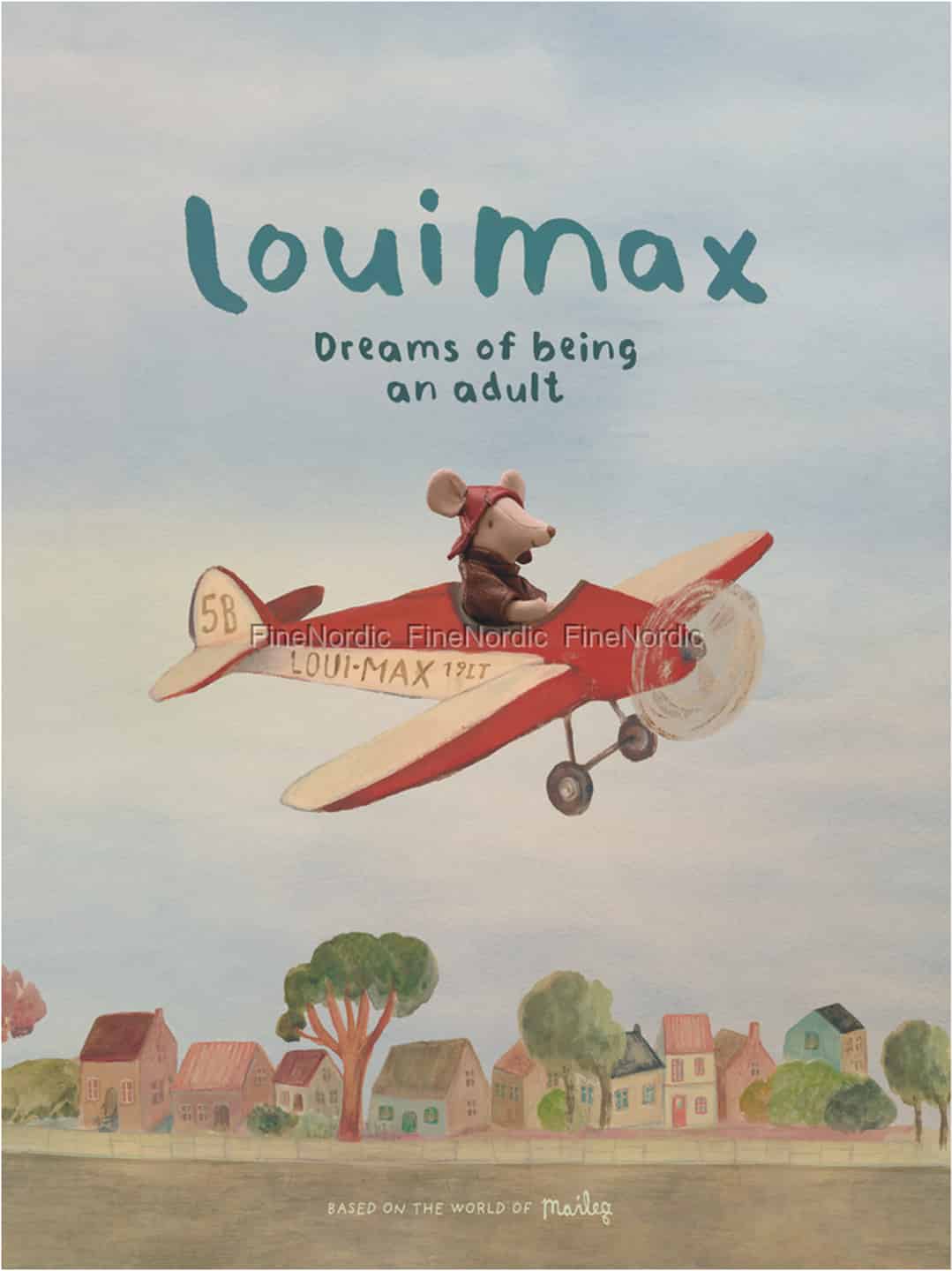 Beobachten Sie, wie der tapfere Flieger LouiMax hoch über einem verschlafenen Dorf in seinem kleinen roten Flugzeug schwebt. Dieses bezaubernde Poster von Maileg fängt einen Moment reiner kindlicher Fantasie ein, in dem die größten Träume zum Greifen nah erscheinen.