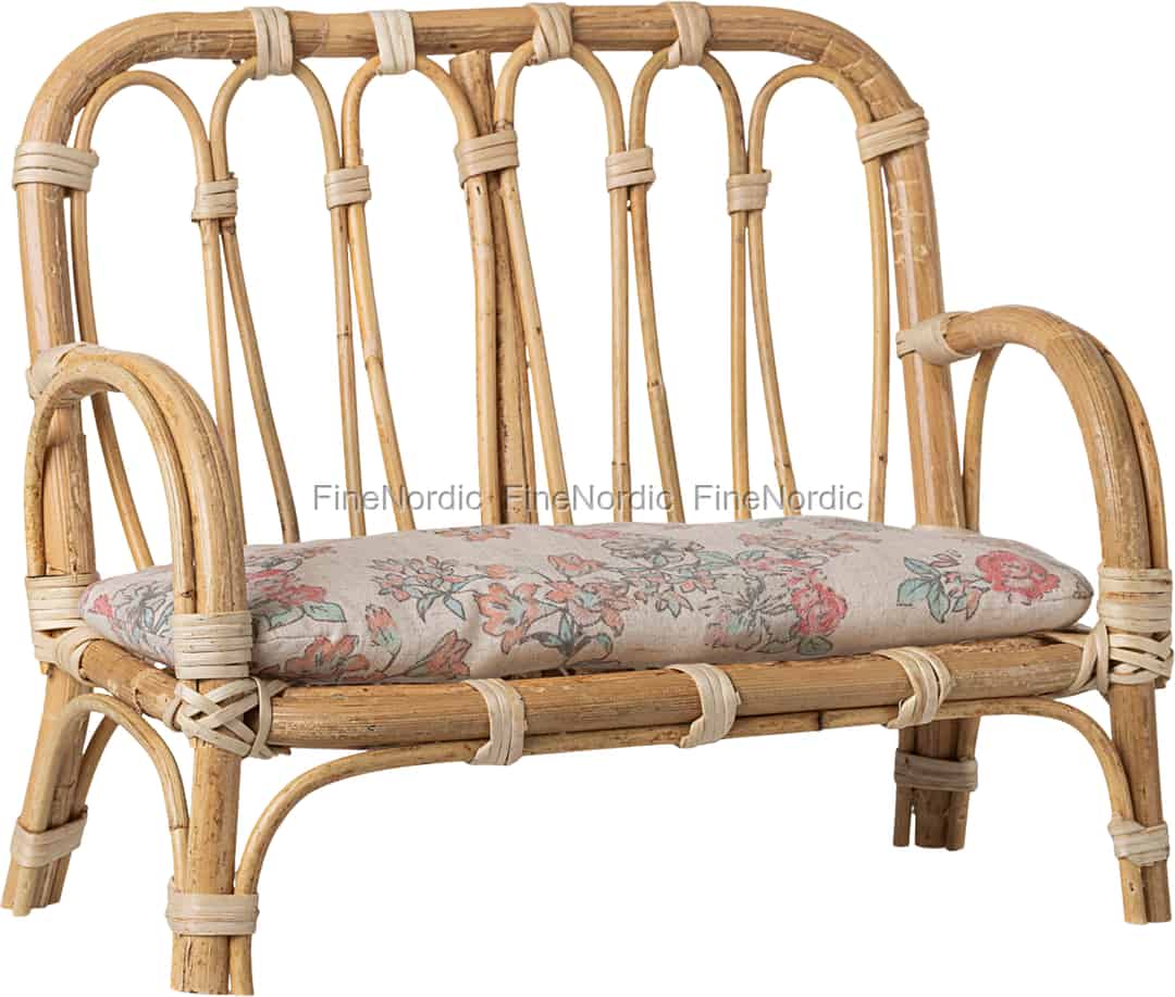 Lade deine Maileg-Freunde zu einem ruhigen Moment auf diesem wunderschönen Rattansofa ein. Mit seiner klassischen Form und dem weichen Blumenkissen ist es ein wundervolles Herzstück, um Geschichten zu erschaffen, und bietet einem geliebten Gefährten einen bequemen Platz zum Ausruhen nach einem langen Spieltag.