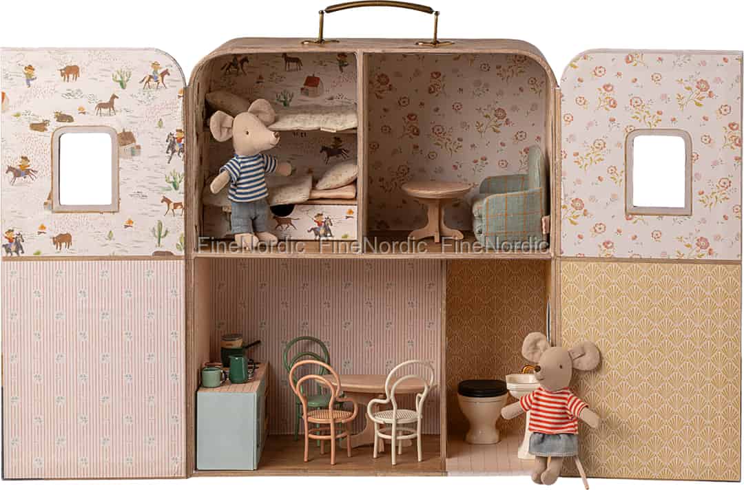 Stell dir ein kleines Haus vor, das überallhin mitreisen kann. Das Maileg SuitCasa sieht von außen wie ein charmanter Reisekoffer aus, doch öffne seine Türen und entdecke ein wundervolles Vier-Zimmer-Heim, bereit für den Einzug deiner kleinsten Freunde.