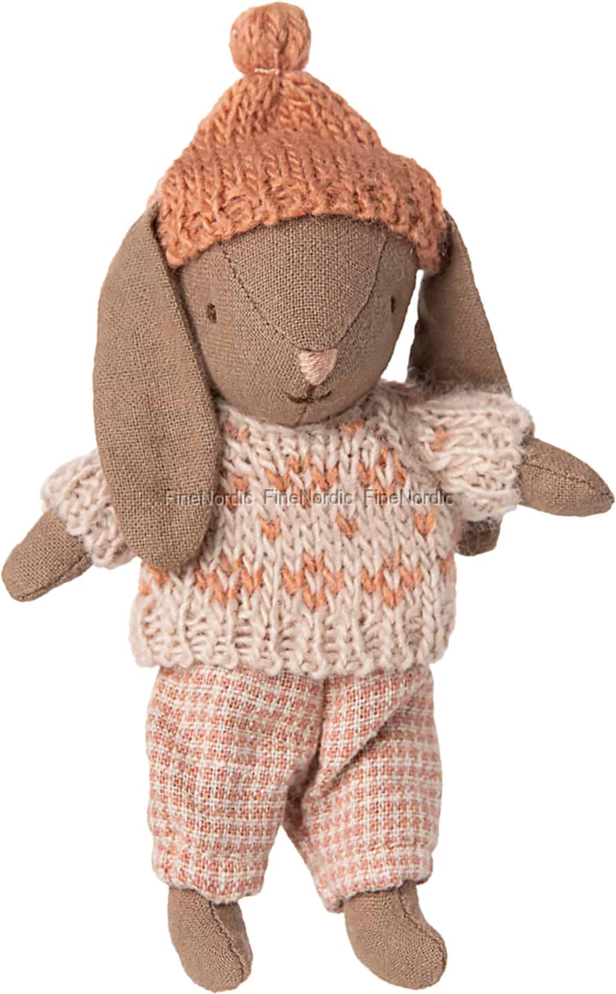 Stellen Sie sich einen klaren Wintertag vor, an dem winzige Fußspuren den Schnee zieren. Dieser süße Hase mit seinem warmen, braunen Textilkörper ist für diesen Anlass perfekt gekleidet. Fühlen Sie die Weichheit seines grob gestrickten Pullovers, der mit zarten rosafarbenen Winkeln gemustert ist, und bewundern Sie den kleinen Bommel auf seiner passenden Mütze. Seine kleine karierte Hose ist ideal für Nachmittage an einem Miniaturkamin, an dem er Geheimnisse mit anderen Maileg-Freunden teilt.