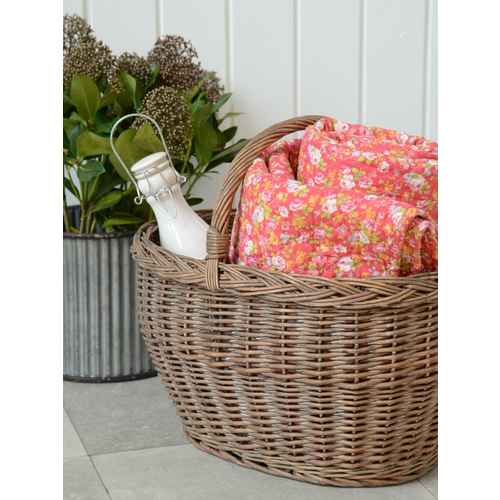 Rice Raffia Einkaufstasche - Stoffbezogen - Ledergriffe - Light Blue Check - Groß