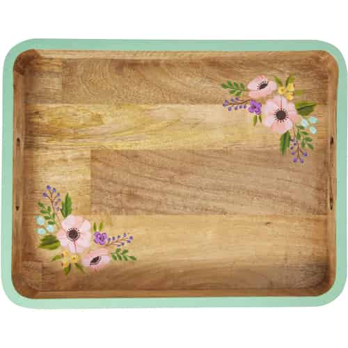 Rice Holztablett - Rechteckig - Handbemalte Minze Egde und Blumen - Groß