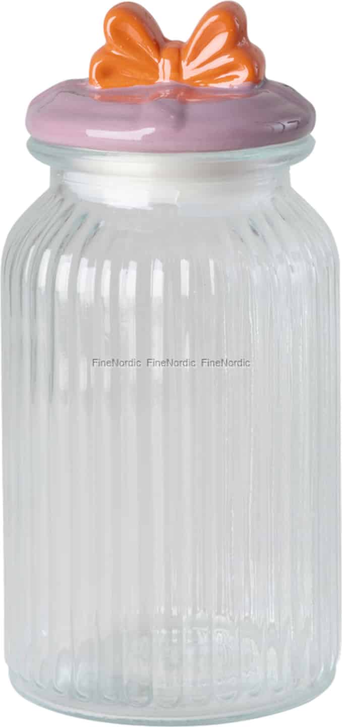 Stellen Sie sich Ihre Küchentheke vor, erhellt von einem Hauch verspielten Charmes. Diese entzückende Glasdose von Rice bewahrt nicht nur Ihre Vorräte auf; sie zaubert Ihnen mit ihrem skurrilen Keramikdeckel in Schleifenform ein Lächeln ins Gesicht.