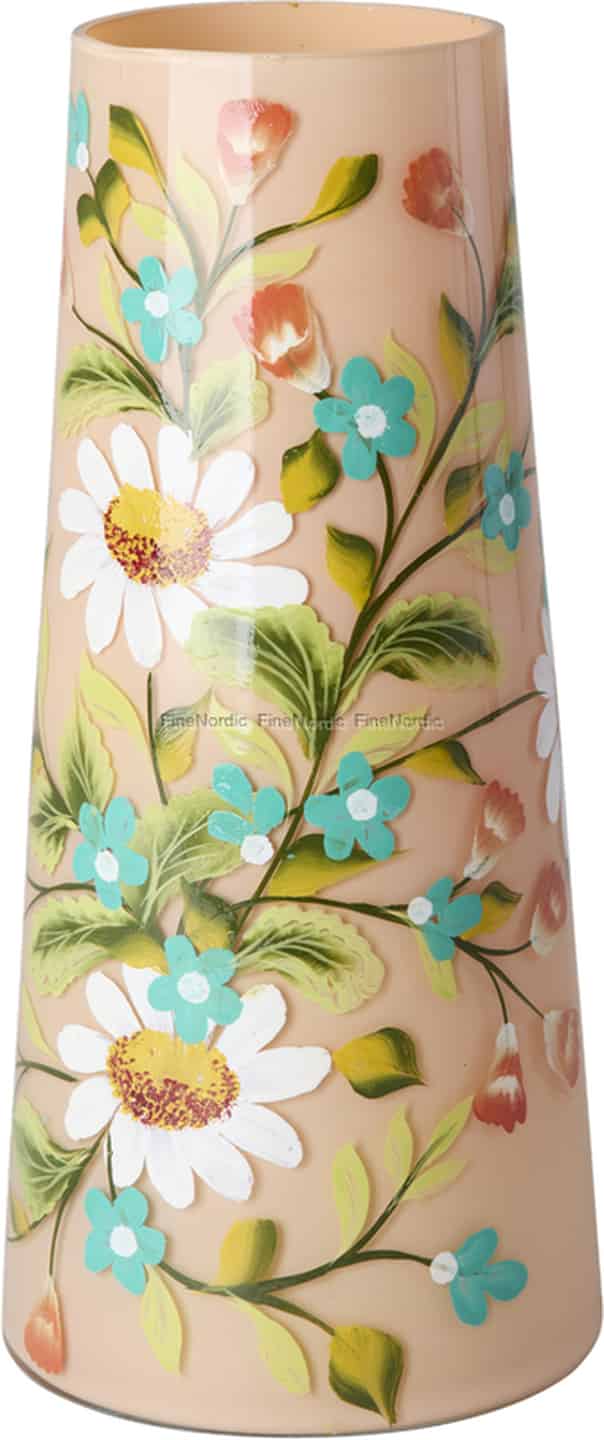 Lassen Sie den fröhlichen Geist einer Sommerwiese das ganze Jahr über in Ihrem Zuhause erblühen. Diese exquisite Glasvase von Rice ist mehr als nur ein Behälter für Blumen; sie ist eine Hommage an Farbe und Handwerkskunst. Das warme, pfirsichfarbene Glas bietet die perfekte Leinwand für die lebendigen, handgemalten Blumen, die sich um ihre Oberfläche ranken. Sie können die reizvolle Textur der erhabenen Farbe unter Ihren Fingerspitzen spüren – die klaren weißen Blütenblätter der Gänseblümchen und die bezaubernden Büschel kleiner blauer Blüten, alle verbunden durch sich windende grüne Stängel. Es ist ein Stück, das eine Geschichte von glücklichen Tagen und künstlerischer Leidenschaft erzählt.