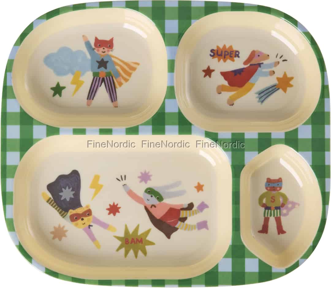 Bereit für ein Abenteuer bei Tisch? Dieser bezaubernde Teller von Rice macht aus jedem Bissen eine heldenhafte Mission. Mit vier praktischen Fächern und einem Team von tierischen Superhelden bringt er Freude und Fantasie auf den Tisch deines kleinen Schatzes.