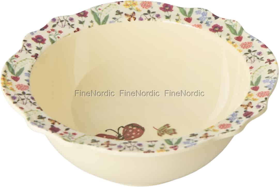 Die gefeierte französische Künstlerin Nathalie Lété verleiht diesem wunderschönen Stück von Rice ihren charakteristischen, verspielten Stil. Das Design ist eine fröhliche Hommage an die Natur und erinnert an botanische Vintage-Illustrationen aus einem geliebten Märchenbuch. Entlang des gewellten Randes entfaltet sich eine Miniatur-Wildblumenwiese mit winzigen Blüten, zarten Schmetterlingen und süßen herzförmigen Beeren, die dazu einlädt, genauer hinzusehen und jedes charmante Detail zu entdecken. Es ist ein Design, das Freude weckt und zum Staunen anregt.