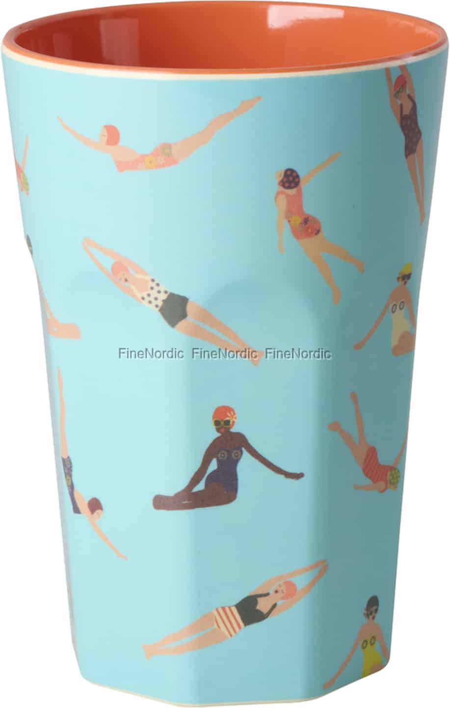 Lassen Sie sich mit jedem Schluck an einen sonnenverwöhnten Nachmittag am Pool entführen. Dieser entzückende hohe Becher von Rice ist mit einer charmanten Schar von Retro-Schwimmern verziert, von denen jeder auf seine eigene stilvolle Weise taucht, treibt und entspannt. Das kühle blaue Äußere bildet die perfekte Kulisse für diese verspielte Szene, während der unerwartete Akzent von warmem Korallenrot im Inneren wie ein Sonnenstrahl wirkt. Es ist ein Design, das eine Geschichte von Muße, Lachen und den einfachen Freuden eines Tages im Freien erzählt.