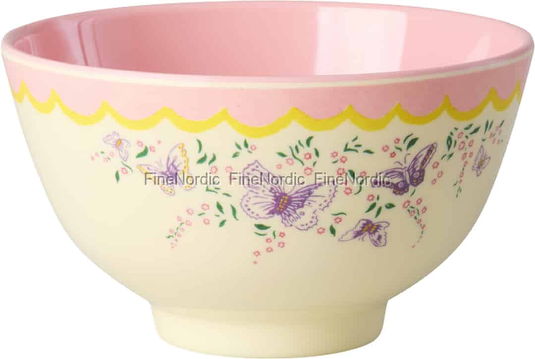 Lassen Sie den sanften Charme eines Bauerngartens auf Ihren Tisch flattern. Die „Spread Your Wings“-Schale von Rice ist eine Hommage an die einfachen Freuden, entworfen, um gewöhnliche Momente besonders zu machen. Die cremefarbene Außenseite bietet eine zauberhafte Leinwand für zarte lila Schmetterlinge, die zwischen winzigen rosa Blüten und grünen Zweigen tanzen. Ein lieblicher Wellenrand in Rosa und Gelb umrahmt das Design, während das glänzend pinke Innere bei jedem Löffel für einen überraschenden, fröhlichen Farbtupfer sorgt. Es ist ein Design, das eine Geschichte von Sonnenschein und sanften Brisen erzählt.