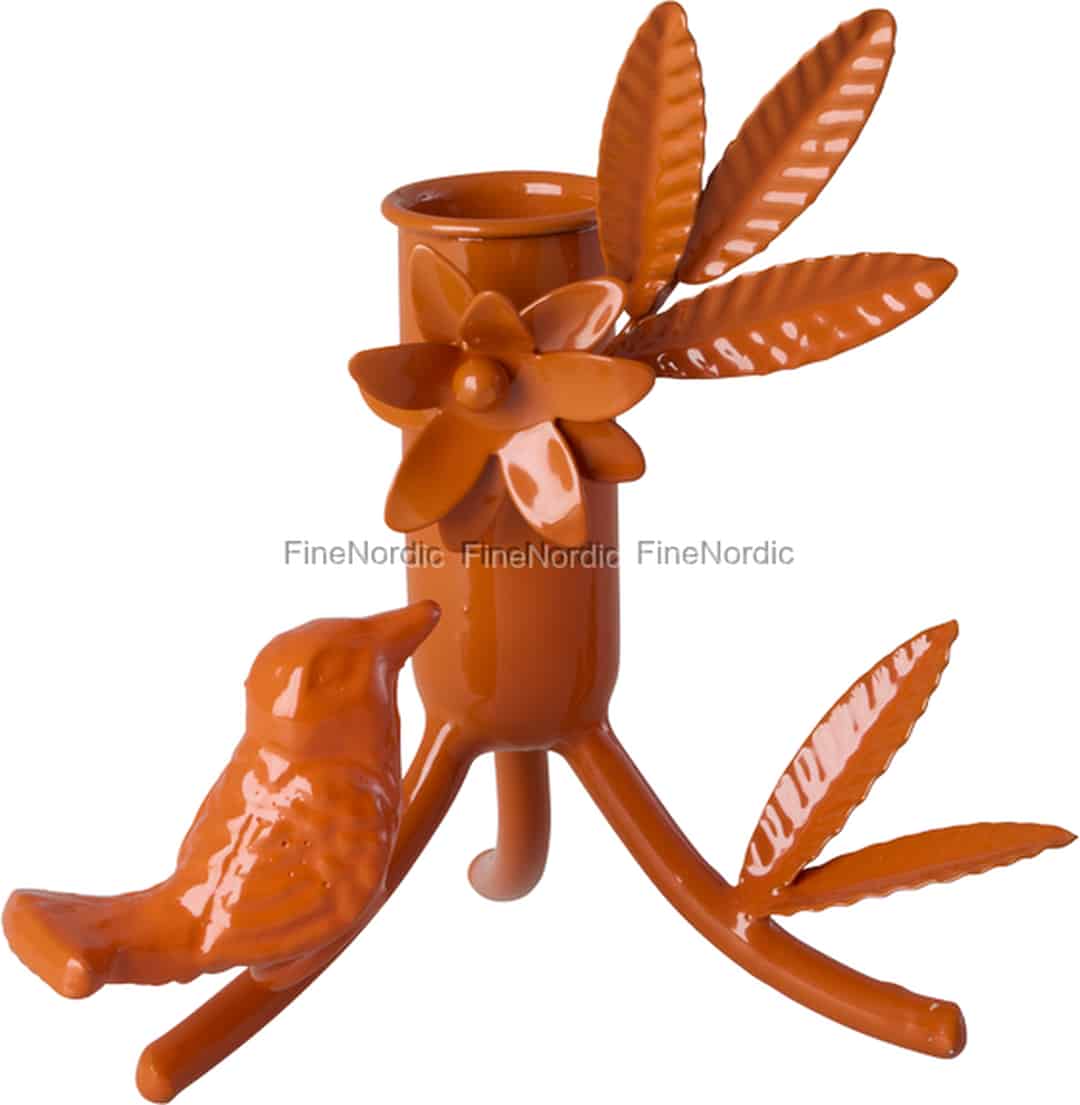 Lassen Sie Ihrer Fantasie mit diesem bezaubernden Kerzenhalter von Rice freien Lauf. Jedes Detail, vom niedlichen Vogel, der auf ein Lied zu warten scheint, bis hin zu den zarten Metallblättern und der Blüte, ist darauf ausgelegt, Freude zu wecken und eine Miniatur-Waldszene direkt bei Ihnen zu Hause zu erschaffen. Die tiefrote, gebrannte Farbe strahlt eine wunderbare Wärme aus, die an Herbstlaub und gemütliche Abende am Kamin erinnert. Es ist ein Stück, das nicht nur eine Kerze hält; es birgt eine Geschichte.