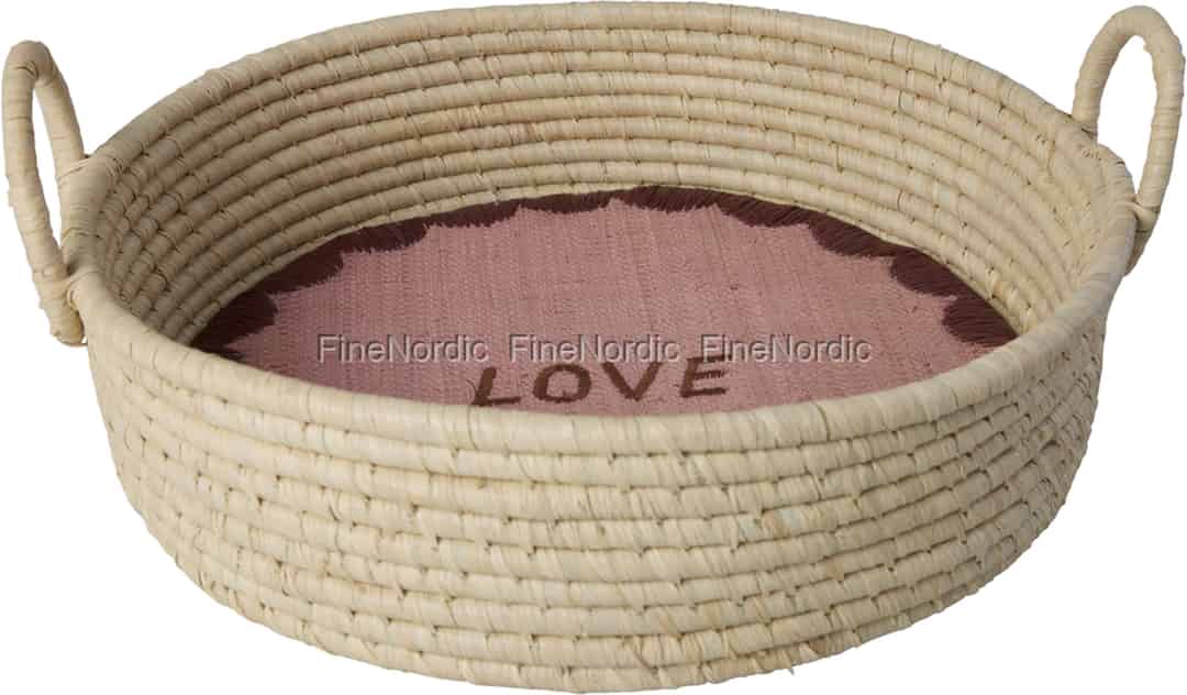 Aus der kreativen Welt von Rice kommt ein Korb, der mehr ist als nur Aufbewahrung; er ist eine kleine Feier der alltäglichen Freude. Jeder Korb wird sorgfältig von Hand aus natürlichem Raffia gefertigt, was ihm einen einzigartigen Charakter und eine herrlich rustikale Textur verleiht, die man gerne berührt. Im Inneren wartet eine entzückende Überraschung: ein altrosa Futter mit einer charmanten Wellenkante und der einfachen, herzlichen Botschaft "LOVE", für alle sichtbar gestickt. Es ist ein Stück, das den farbenfrohen, lebenslustigen Geist seiner dänischen Schöpfer verkörpert.