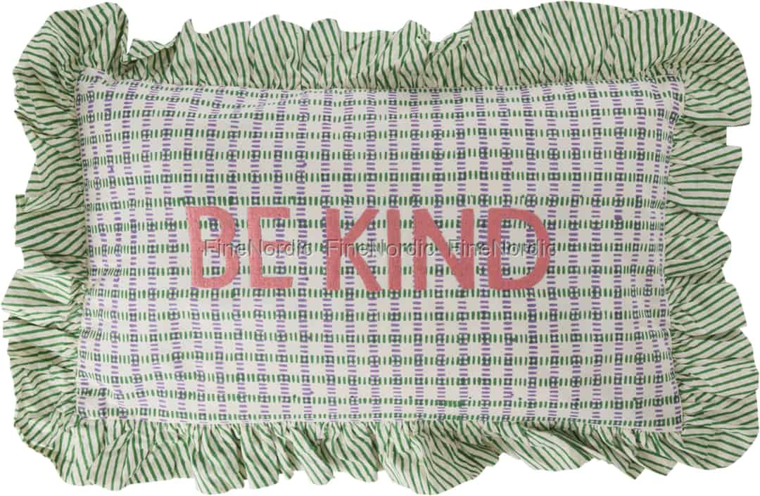Stellen Sie sich vor, Sie lassen sich in Ihren Lieblingssessel sinken und werden von dieser sanften Botschaft begrüßt. Dieses wunderschöne Kissen von Rice ist nicht nur ein weicher Ort zum Ausruhen; es ist eine kleine, tägliche Erinnerung daran, mit Freundlichkeit voranzugehen, verpackt in entzückenden Farben und Mustern.